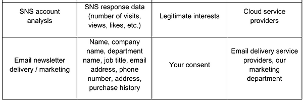 ・Automatically from you: Automatic collection via cookies, access logs, etc. (IP address, browser information, etc.).